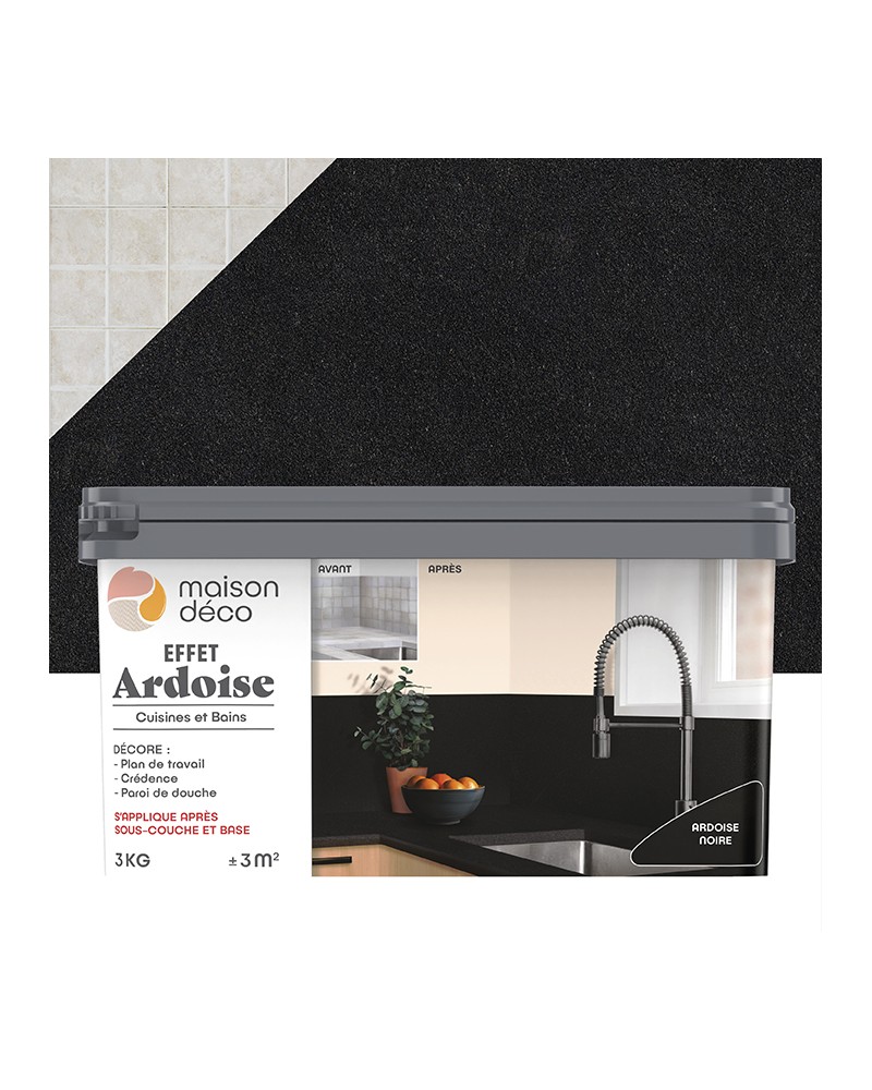 Avec l’effet ardoise, faites disparaître votre ancien carrelage et laissez place à une ambiance plus contemporaine ! L’effet Ardoise est un enduit coloré prêt à l’emploi qui s’applique après la Base pour effet sur carrelage mural, plan de travail ou paroi de douche.