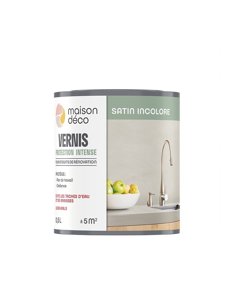Pour une protection de mon enduit de rénovation/finition sur les surfaces peu soumises aux projections d'eau telles que les crédences et plan de travail, j’utilise le Vernis Protection Intense Satin.