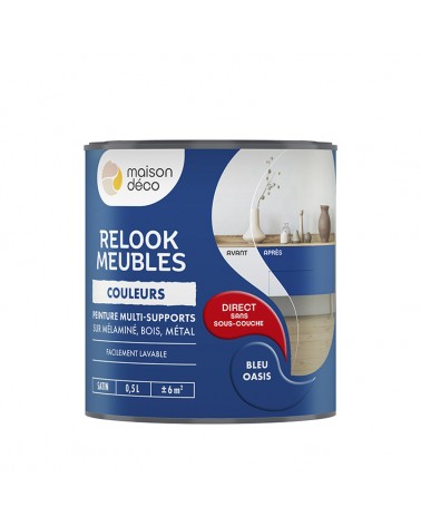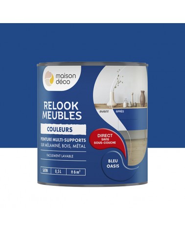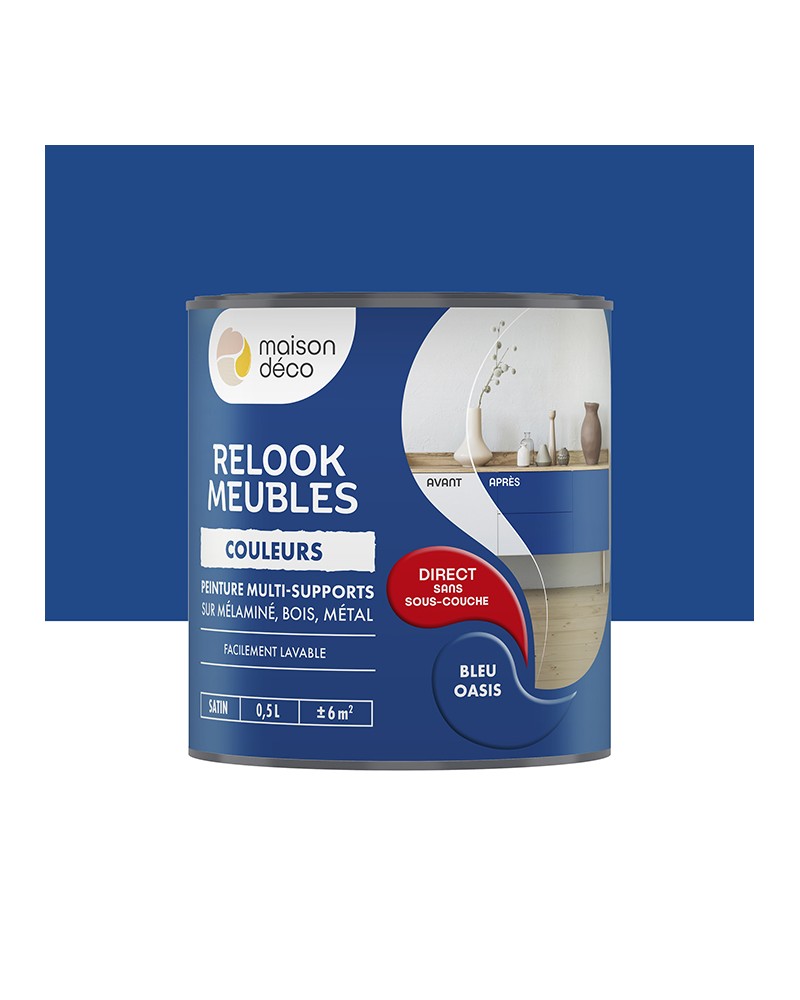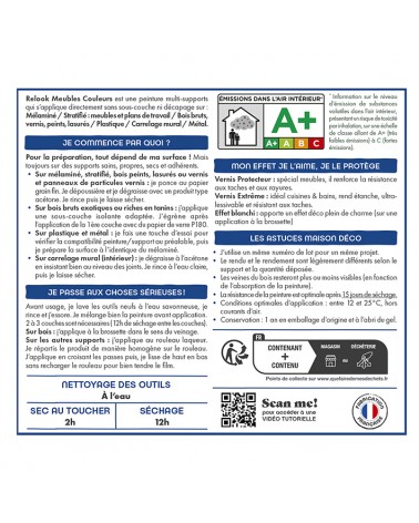 Relook Meubles Couleurs est une peinture satin multi-supports qui s’applique directement sans sous-couche ni décapage. Faisant écho à la tendance de la customisation, du Ikéa™ hacking ou de l’upcycling, sa formulation riche en pigments vous permettra de recouvrir vos anciennes couleurs quel que soit le support : métal, plastique, mélaminé, bois ou carrelage mural.