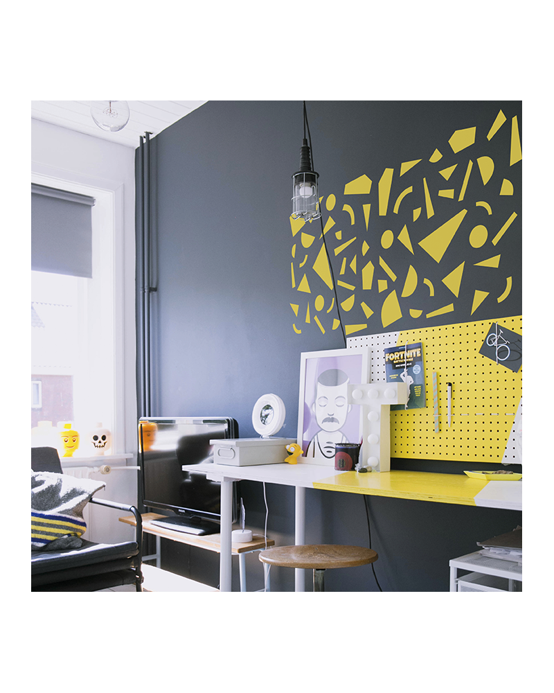 Pour un style arty, industriel ou moderne, les pochoirs gommettes peuvent être utilisés en monochrome avec des couleurs vives comme notre jaune Relook Tout, sur un mur sombre (bleu nuit, Relook Tout Finition). Vous pouvez également opter pour différentes couleurs de notre gammes Relook Meubles Couleurs et faire un clin d’œil au motif Terrazzo : effet art déco garanti !