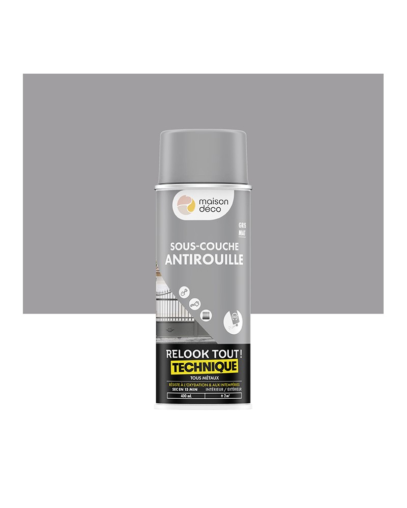 Relook Tout Technique - Sous-couche Antirouille est une sous-couche aérosol ultra couvrante qui protège durablement de la rouille et améliore l’adhérence des métaux ferreux neufs ou anciens. Elle s’applique directement sur tous types de métaux.