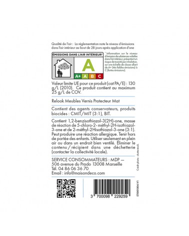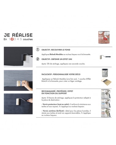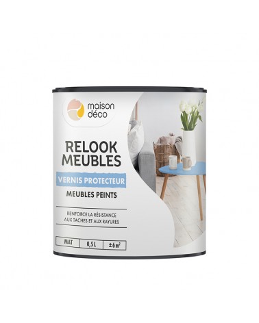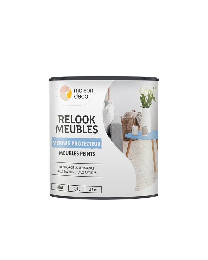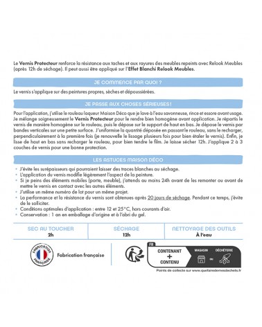 Ce vernis protège de l’eau, des rayures et des taches vos meubles repeints avec RELOOK MEUBLE (après 12h de séchage).